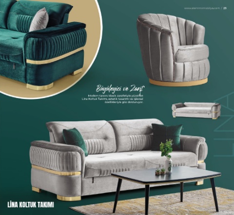 www.alemmomobilya.com / 23 Büyüleyici ve Zarif Modern tarzını klasik zarafetiyle yücelten Lina Koltuk Takımı, estetik tasarımı ve işlevsel özellikleriyle göz dolduruyor. LİNA KOLTUK TAKIMI