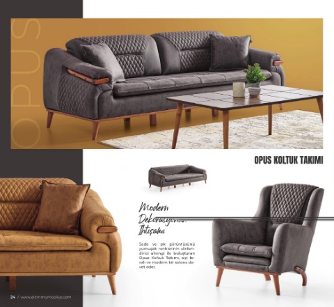 OPUS KOLTUK TAKIMI Sade ve şık görüntüsünü yumuşak renklerinin dinlen- dirici ahengi ile buluşturan Opus Koltuk Takımı, sizi fe- rah ve modern bir salona da- vet eder. 24 / www.alemmomobilya.com