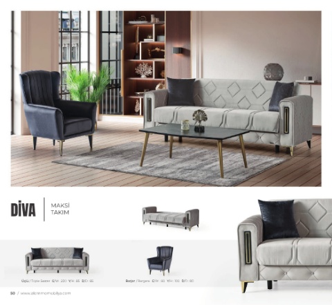 DİVA MAKSİ TAKIM Üçlü / Triple Seater G/W : 220 Y/H : 85 D/D : 85 Berjer / Bergere G/W : 80 Y/H : 100 D/D : 80 50 / www.alemmomobilya.com